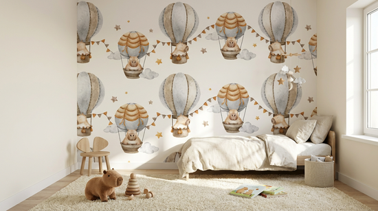 An adorable design of capybaras traveling in hot air balloons over a light background, created to bring fantasy and joy to any children's room. Capy Balloon creates a light and serene atmosphere, perfect for bright and simple rooms where imagination can soar.