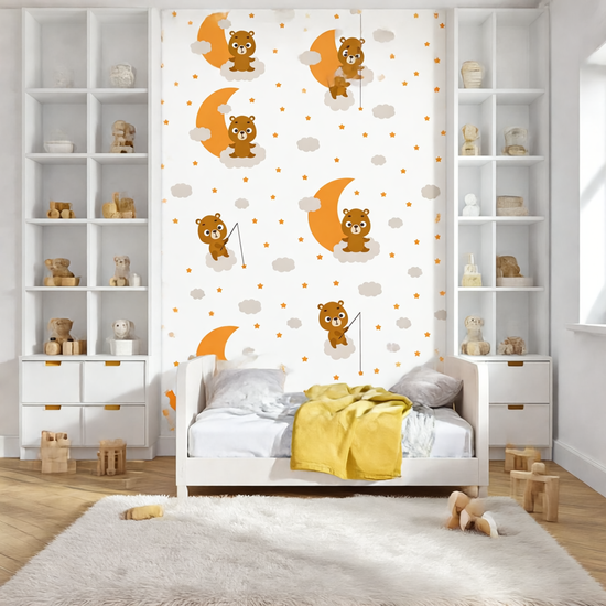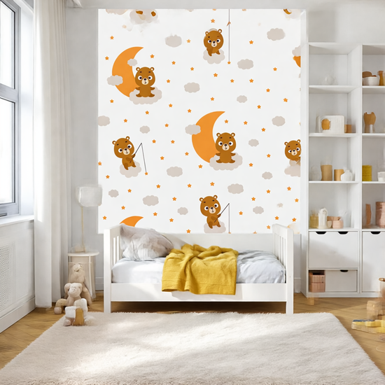 A cute bear sitting on the moon, “fishing” for dreams against a soft, charming background. Perfect for creating a whimsical, tender, and calming atmosphere in a child's room.