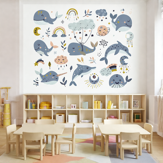 A white background with cute, friendly little whales, perfect for a playful and tender children's space. Ideal for sparking imagination and adding gentle charm to any room.
