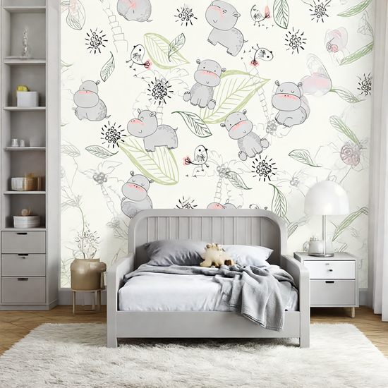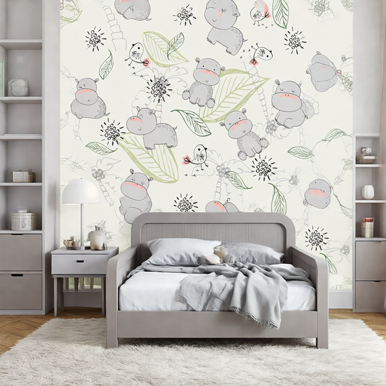 A soft background featuring gentle little hippos with delicate leaves around them, creating a calm and adorable atmosphere for children. Perfect for a tender and whimsical children's room.