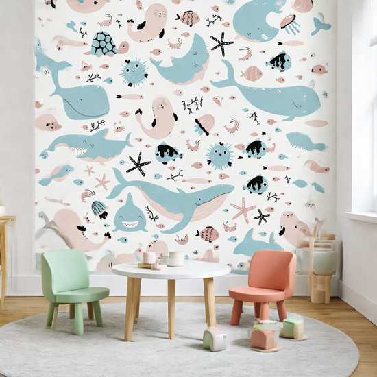 A white background filled with cute marine animals, such as dolphins, whales, and turtles, designed to create a fun and whimsical children's space. Perfect for sparking imagination and turning any room into a magical underwater world.