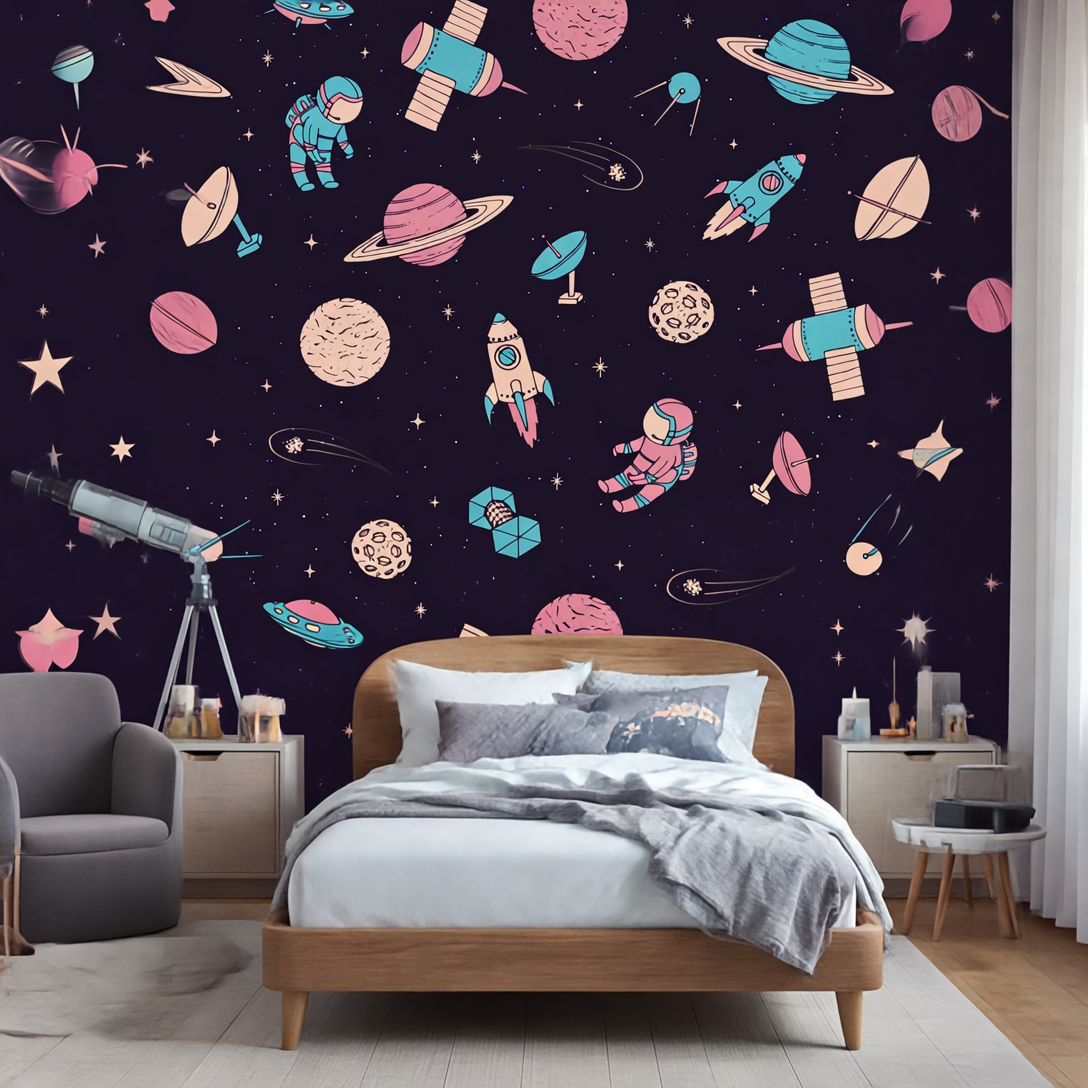 An elegant dark-background wallpaper featuring pink planets and astronauts, designed to spark imagination and wonder. Perfect for children who love space and astrology, it creates a dreamy, playful, and stylish atmosphere with a modern touch.